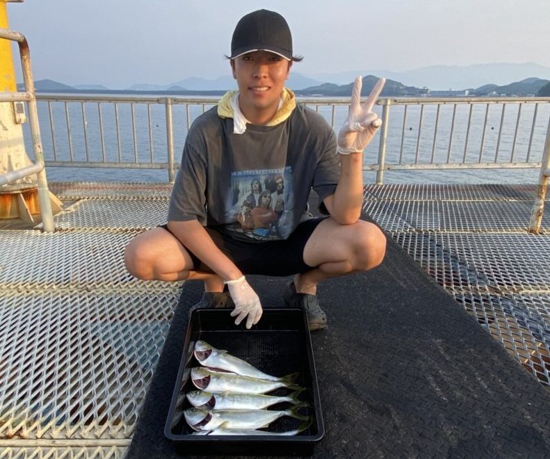 富田新港でアジ15cm頭に20尾、カマス15cm頭に20尾、アコウ35cm頭に2尾、カワハギ25cm頭に10尾。