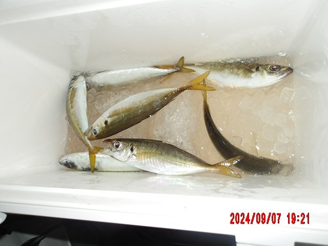 アジ25cm頭に21尾、カワハギ15cm頭に5尾、メジナ20cm頭に5尾、サヨリ30cm、サバ20cm。