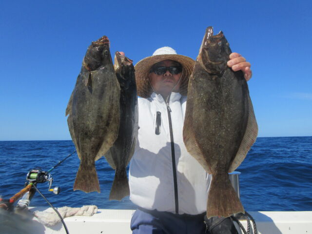 ノマセ釣りのヒラメが食いコンスタントです。エサが小アジになっており、50~60cmを主体に70cmオーバーがまじる日もあり、船中では連日ボーズなし。アコウ30~45cm、ガシラ、アオハタ、マトウダイ、青物などのゲストもよくまじっています。