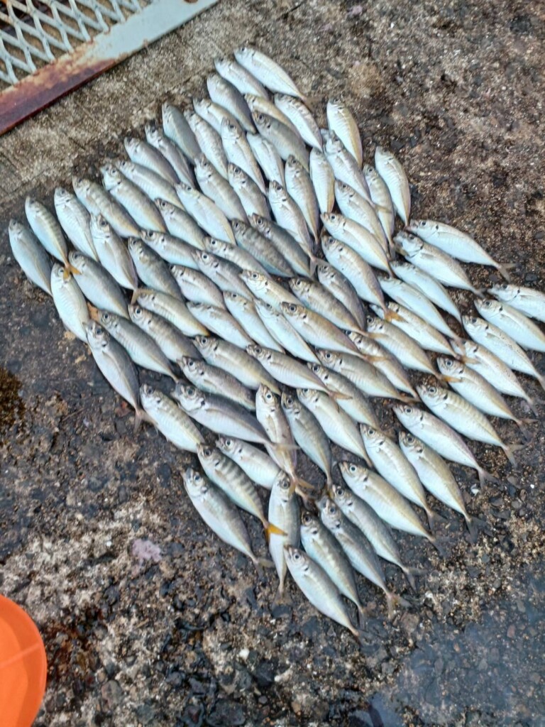 豆アジから20cm前後が釣れており、薄暗い朝夕に数が釣れています。足元で釣れるので、子供でも釣りやすいです。