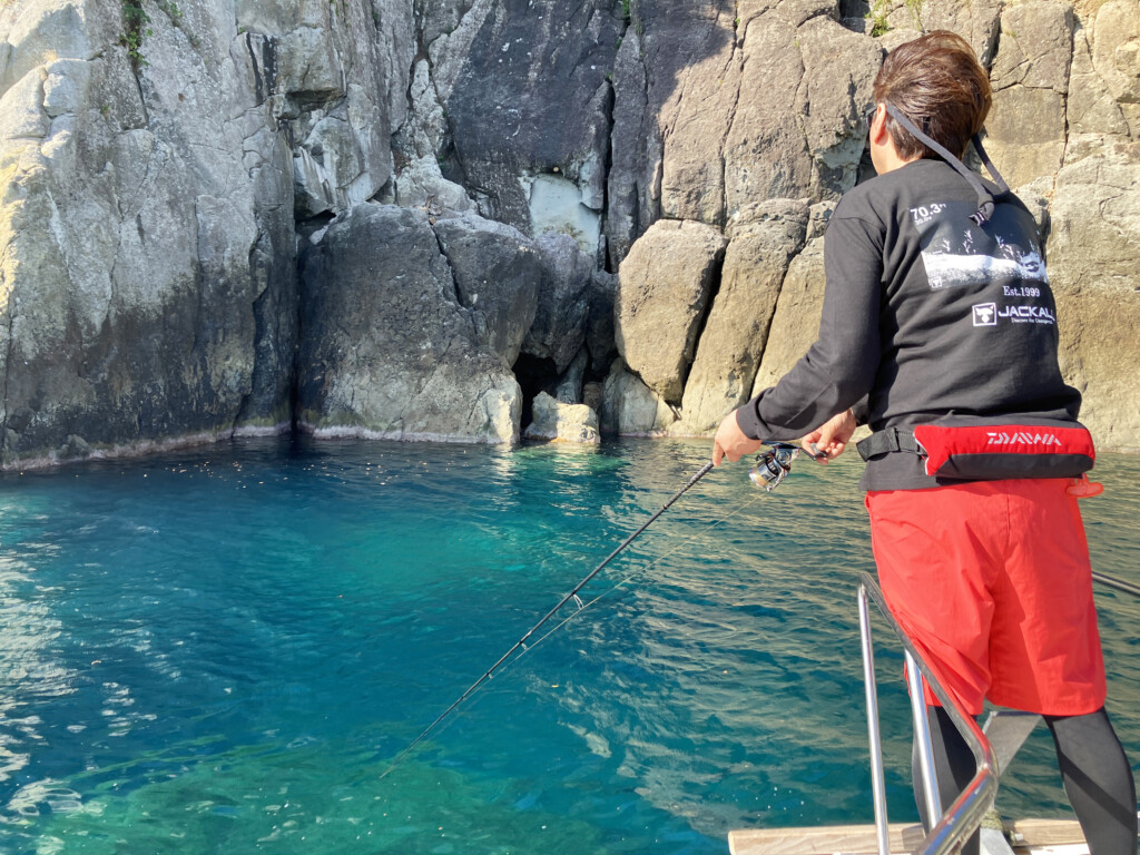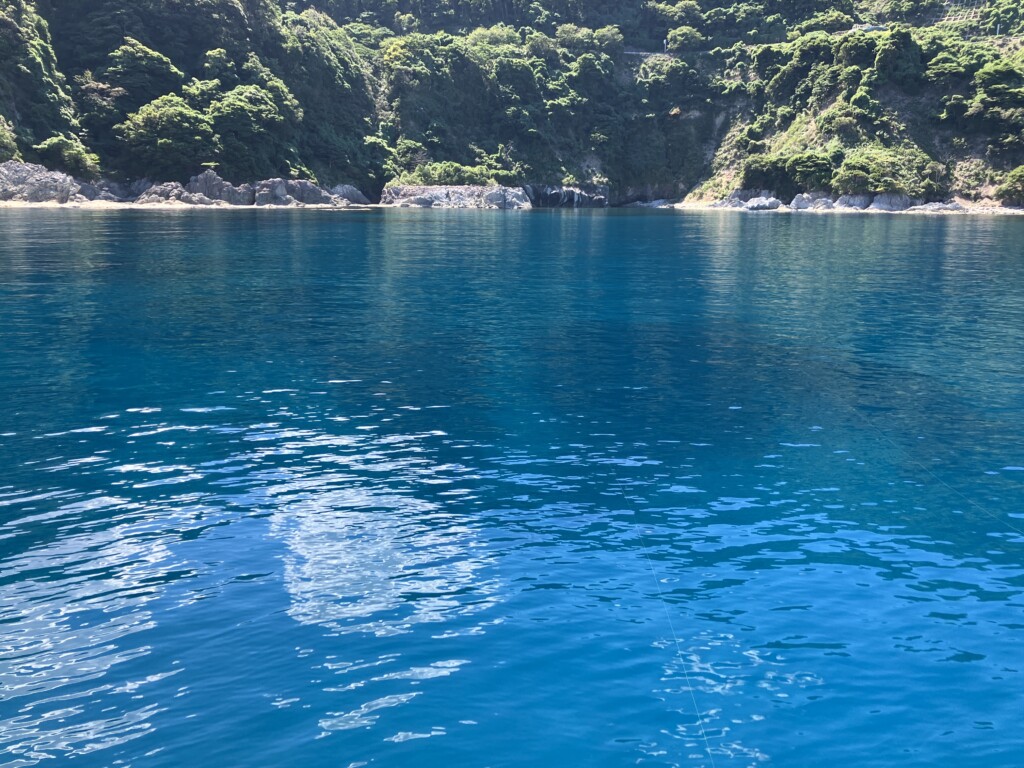 このエリアは水の透明度が高い(当日は水深18mのポイントでも底が見えました)ので、キャストの際は、黒く見えるシモリを狙っていきましょう。