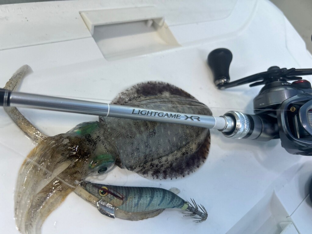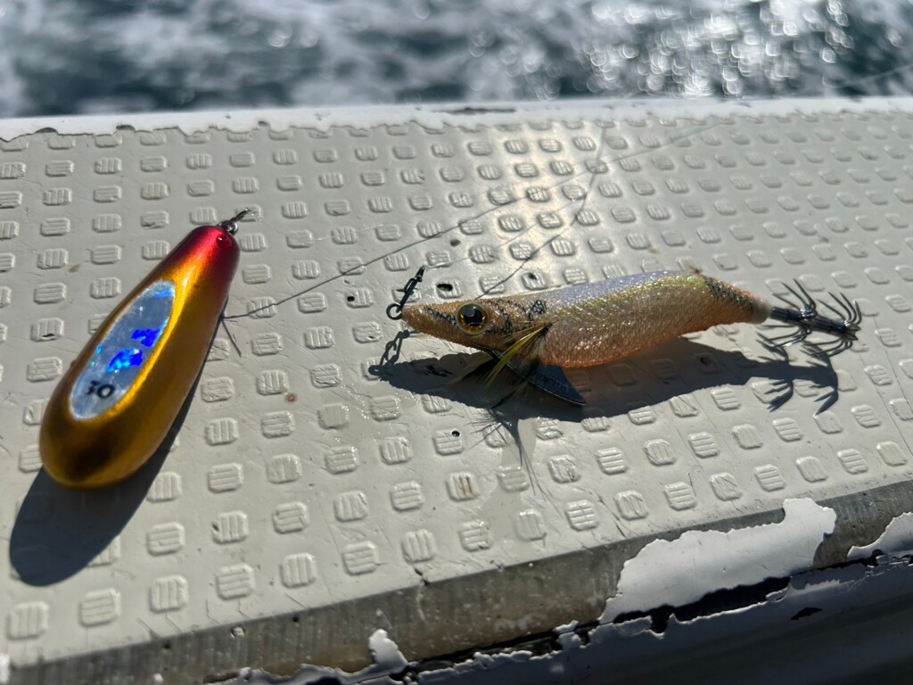 小さいエギを使った理由ですが、釣れているアオリイカの胴サイズはコロッケサイズが多いからです。また、ゲストとして高級な剣先イカも狙えるため、今回は小さいエギを選びました。シーズンが進んでイカのサイズが上がれば、エギも3~3.5号がメインになります。