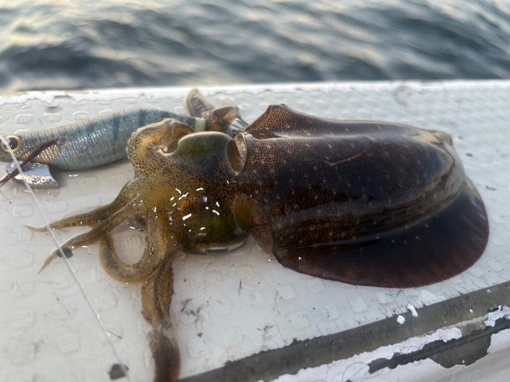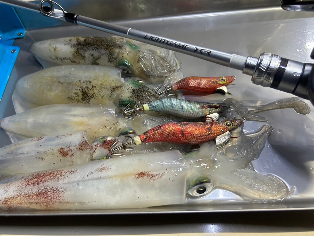 時折剣先イカも交じり、最終的には十分な釣果に恵まれました。このエリアの船アオリ便は11月頃まで続きます。シーズンが深まるにつれて、アオリイカの引きも強烈になってくるので、ぜひこの機会に船アオリ便にチャレンジしてみてください!
