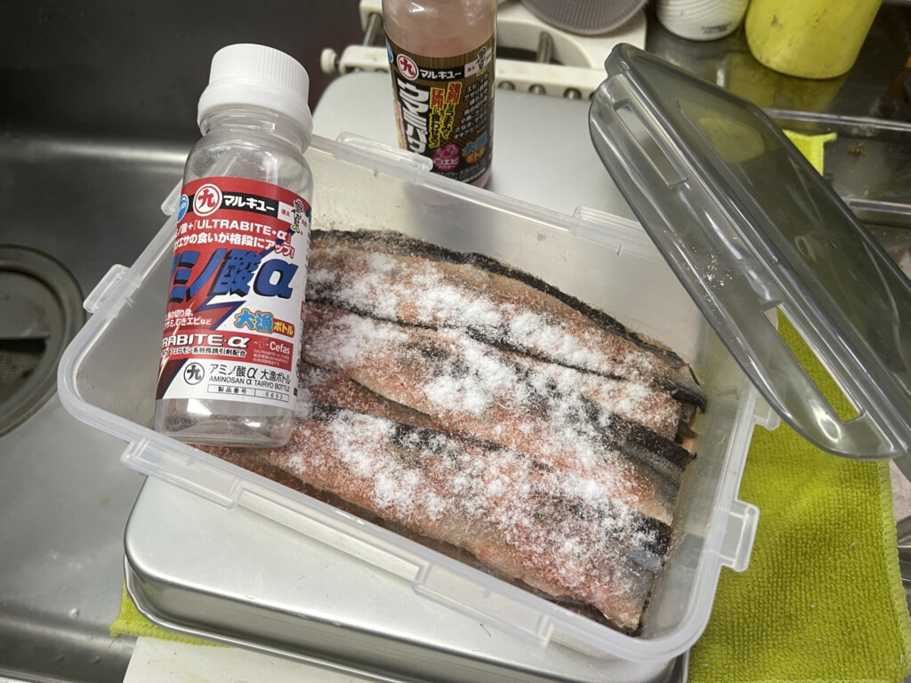 エサは、大阪湾スタイルのガチ締めサンマ。