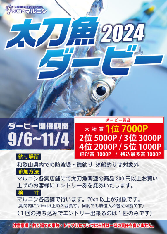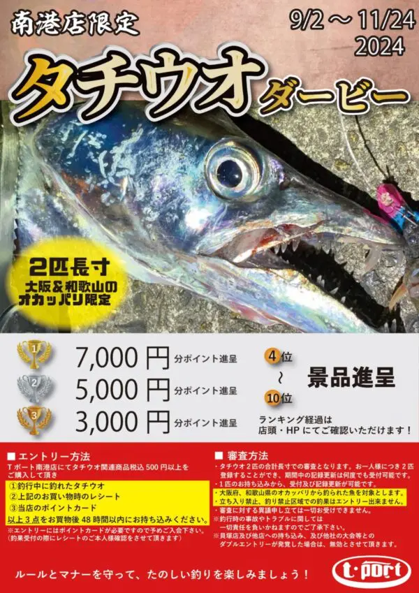 「南港店限定タチウオダービー」開催。大阪、和歌山の陸っぱり限定で、2尾長寸を競う。詳細はHPにて。