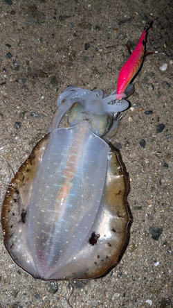 明石周辺でコウイカ胴長20cm頭に2ハイ、アオリイカ胴長22cm頭に10パイ。
