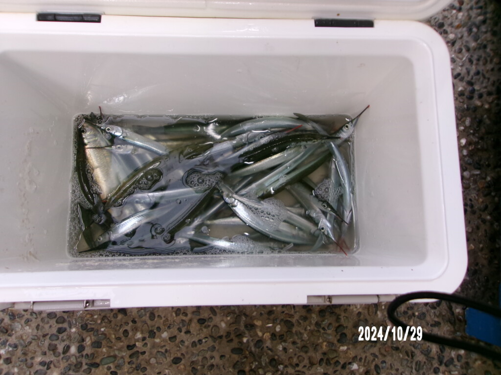 アジ23cm頭に4尾、小アジ15cm頭に23尾、サッパ17cm頭に140尾、カタクチイワシ13cm頭に220尾、コノシロ22cm1尾、サバ23cm頭に2尾、ヒイラギ8cm頭に60尾、サヨリ26cm頭に300尾、チヌ45cm頭に3尾、キビレ23cm頭に4尾、メジロ79cm頭に2尾、ブリ83cm