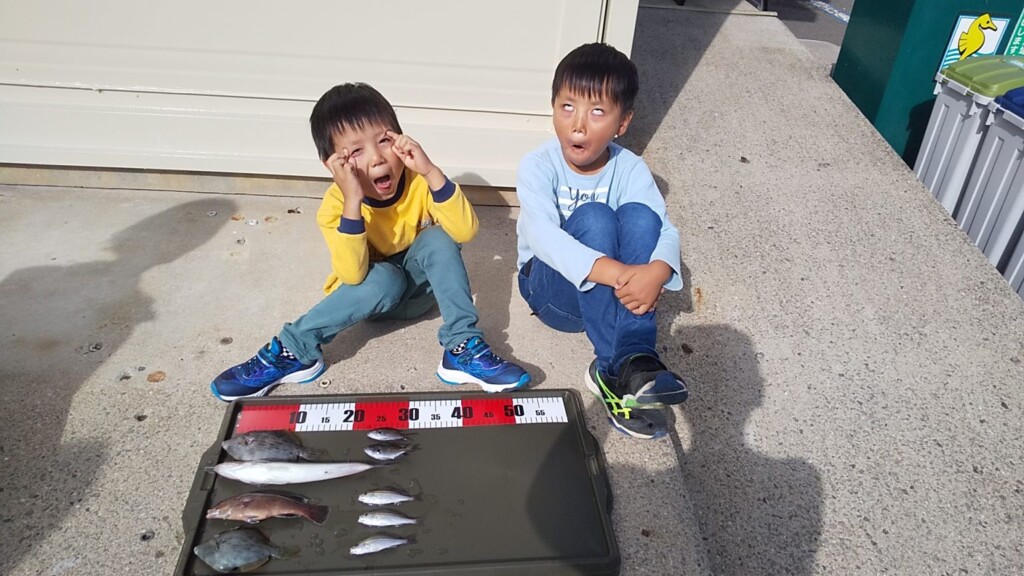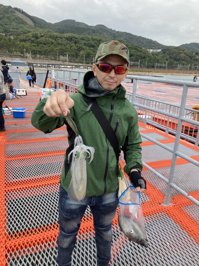 ヒラスズキ45cm、シオ42cm、ハマチ42cm、チヌ36cm、アイゴ30cm頭に多数、グレ25cm頭に3尾、キビレ1尾、カワハギ18cm頭に15尾、アオリイカ470g、小アジ少々。