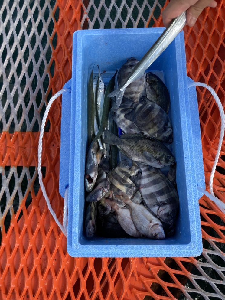 アイゴ5尾、オコゼ25cm1尾、サヨリ1尾、カワハギ5尾、ハマチ45cm1尾、メジロ65cm1尾、メバル3尾