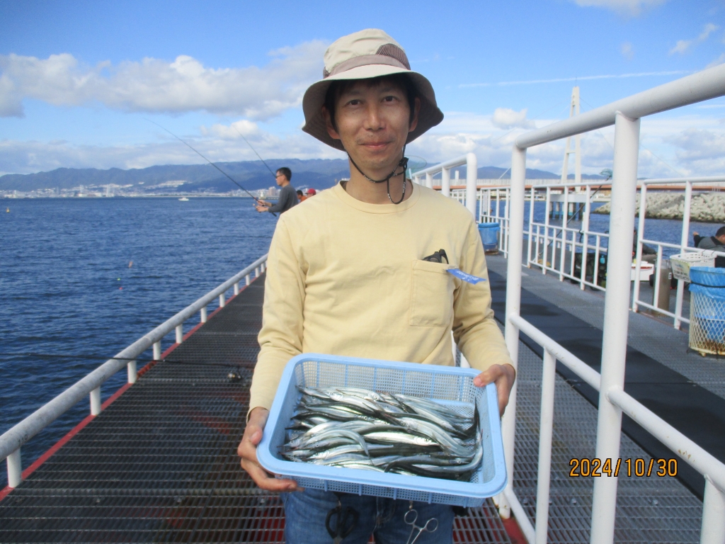 アイゴ2尾、アオリイカ3バイ、サンバソウ25cm1尾、シオ40cm頭に4尾、小ダイ25cm頭に5尾、マダイ35cm1尾、チヌ50cm1尾、ツバス35cm頭に6尾、カワハギ30尾、ハマチ40cm頭に2尾、メジロ65cm頭に3尾
