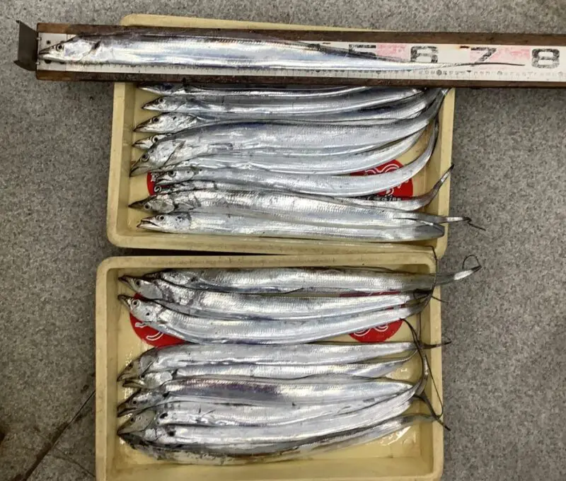 明石周辺でタチウオ幅指3本半頭に2尾、アオリイカ胴長18cm。