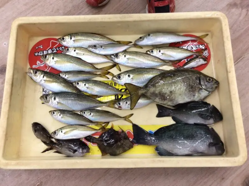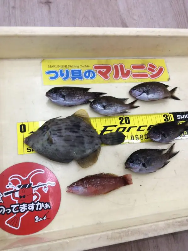 田ノ浦のサビキ釣りでアカネさんグレ、カゴカキダイなど、田ノ浦の胴突き釣りでアイリさんカワハギ、スズメダイ、ベラなど。