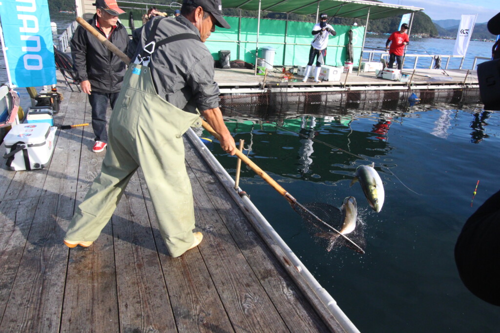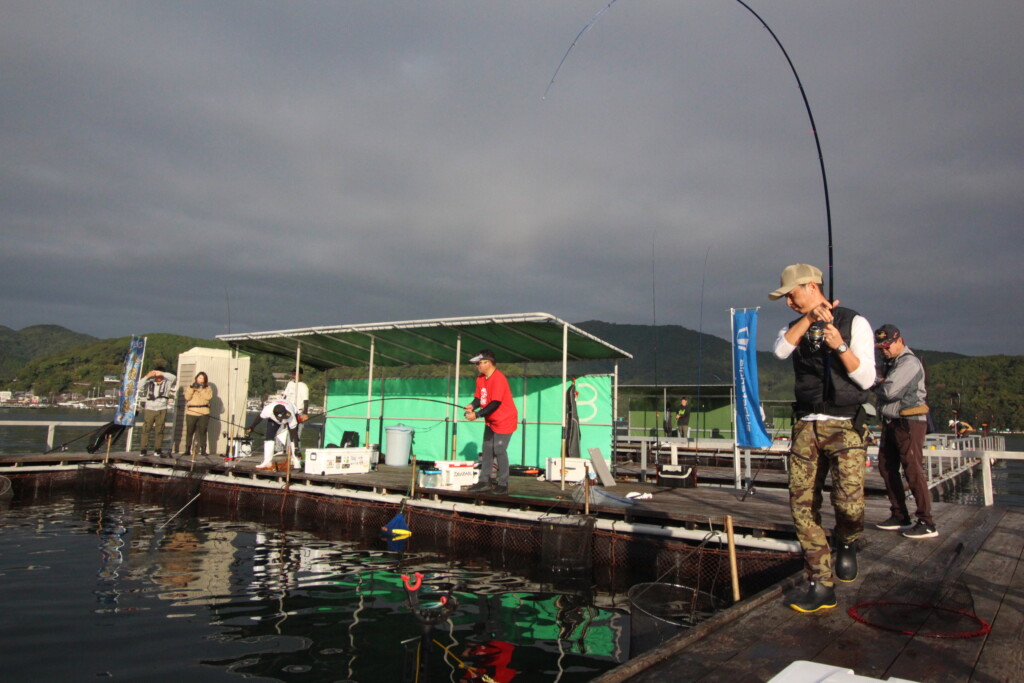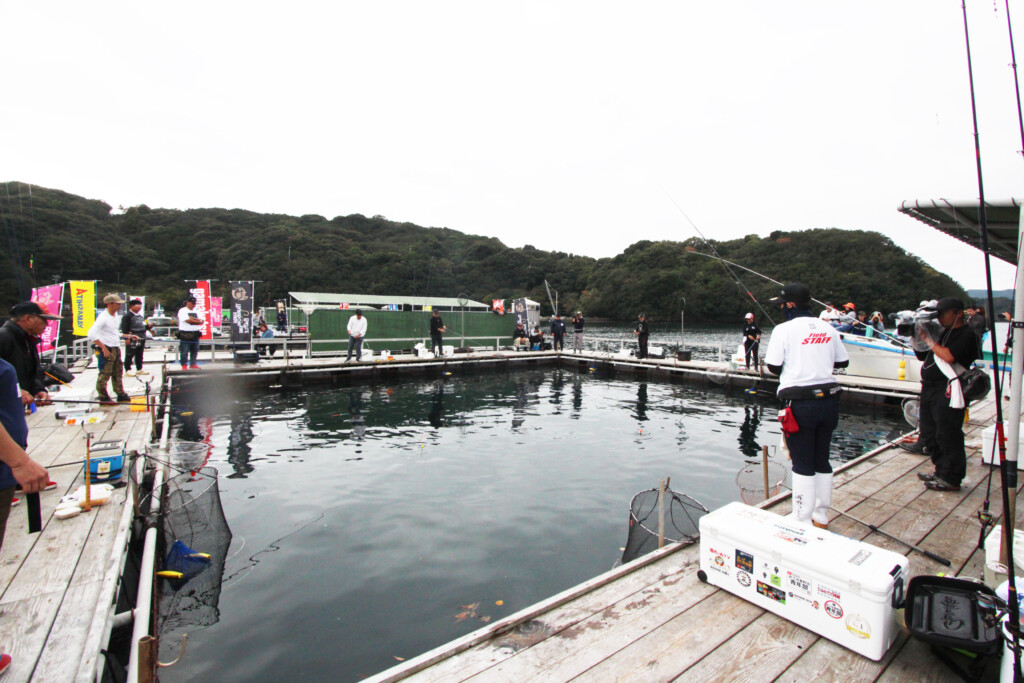 10月に行われたセミファイナルを勝ち上がり、ファイナルへ駒を進めた16人が、海上釣り堀辨屋の大イケス2つに分かれて、8時に試合がスタートしました。