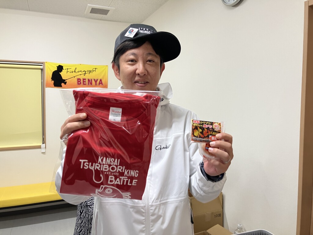 また、朝の受付時には参加賞として、大会のオリジナルTシャツと釣り堀用ダンゴエサが配られました。