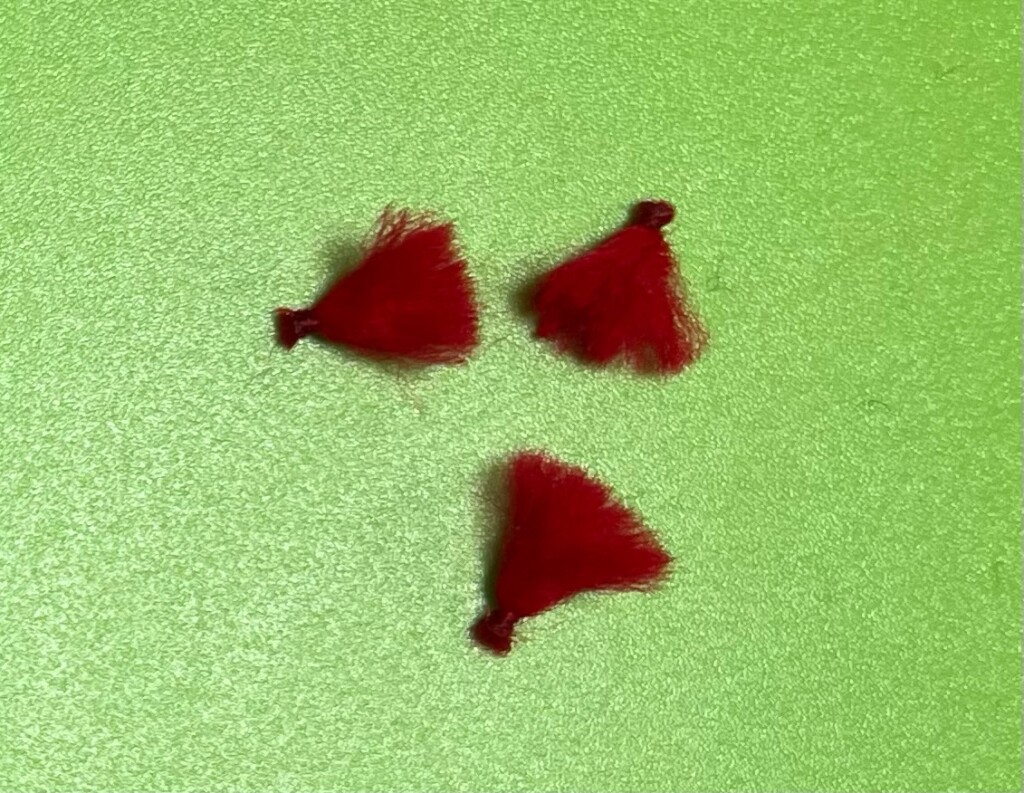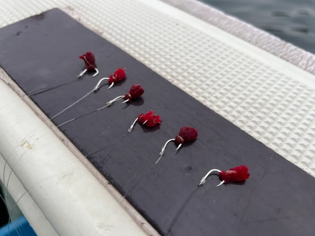 オモリを海底にコロコロと転がすから、そう呼ばれているようですが、この赤い毛糸はミミイカを模しています。茱(ぐみ)の実のように小さいミミイカの子供を「グミイカ」と呼び、加太では昔からマダイ釣りのエサとして使ってきました。最近はこのエサが取れなくなったのか、毛糸で代用するようになったようです。