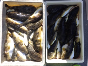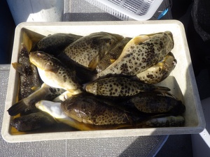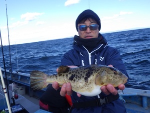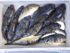 グッドサイズのヒガンフグが釣れています。このサイズだと、テッサにしても最高です。
