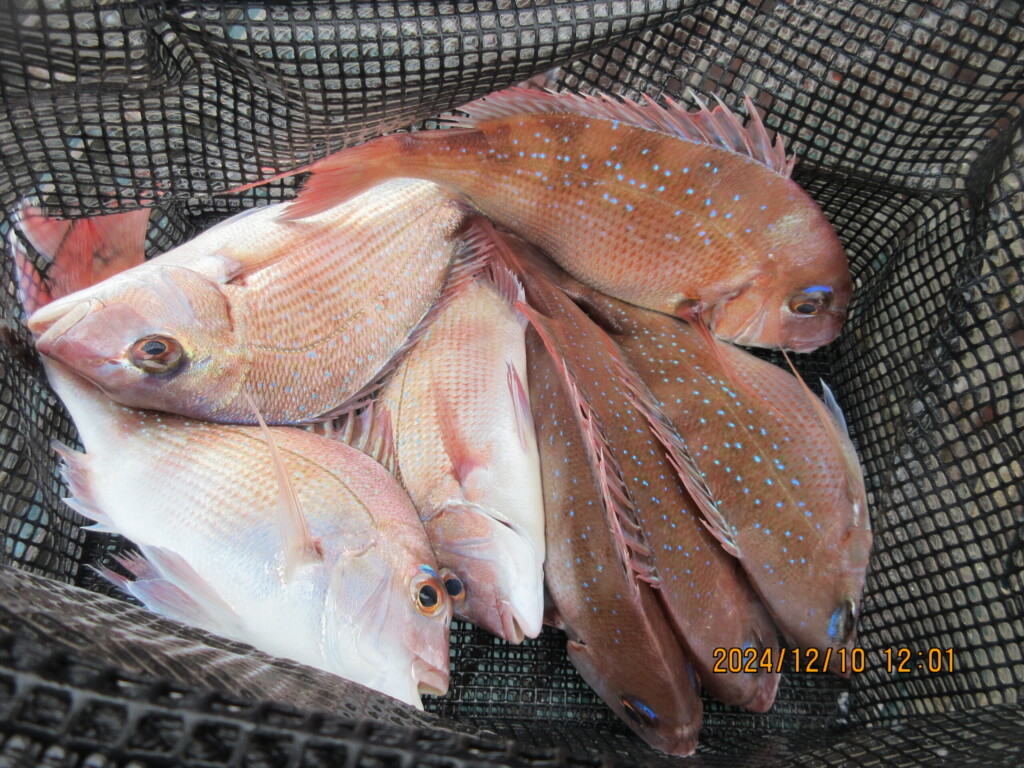 マダイ48cm、ヒラスズキ47cm、アコウ28cm、カレイ25cm、アジなど。