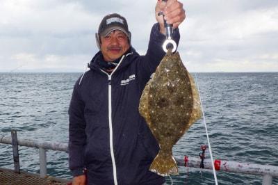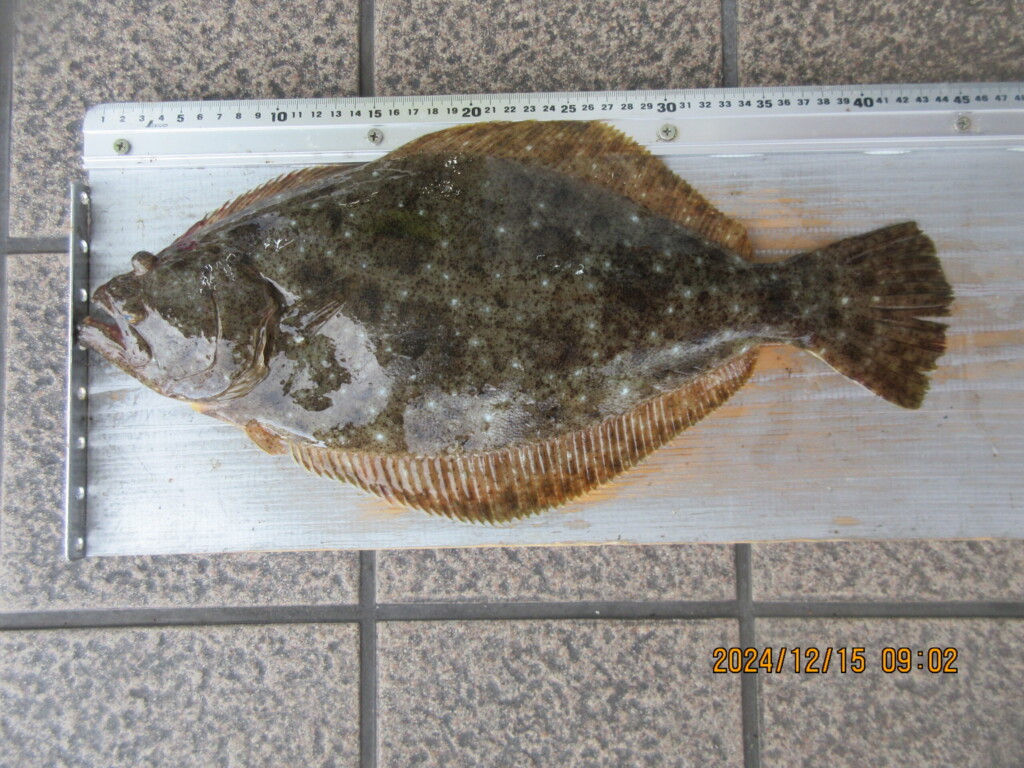 ヒラメ45cm、チヌ30cm頭に3尾、小ダイ7尾、カワハギ4尾、サンバソウ1尾、ガシラ1尾、小アジ少々。