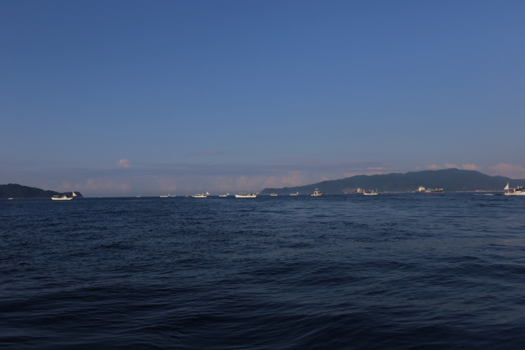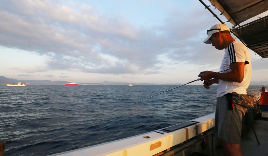 まだ辺りが薄暗い中、出船した小嶋丸はおよそ15分ほどかけて、オコセと呼ばれる友ケ島周辺のポイントへと移動する。
