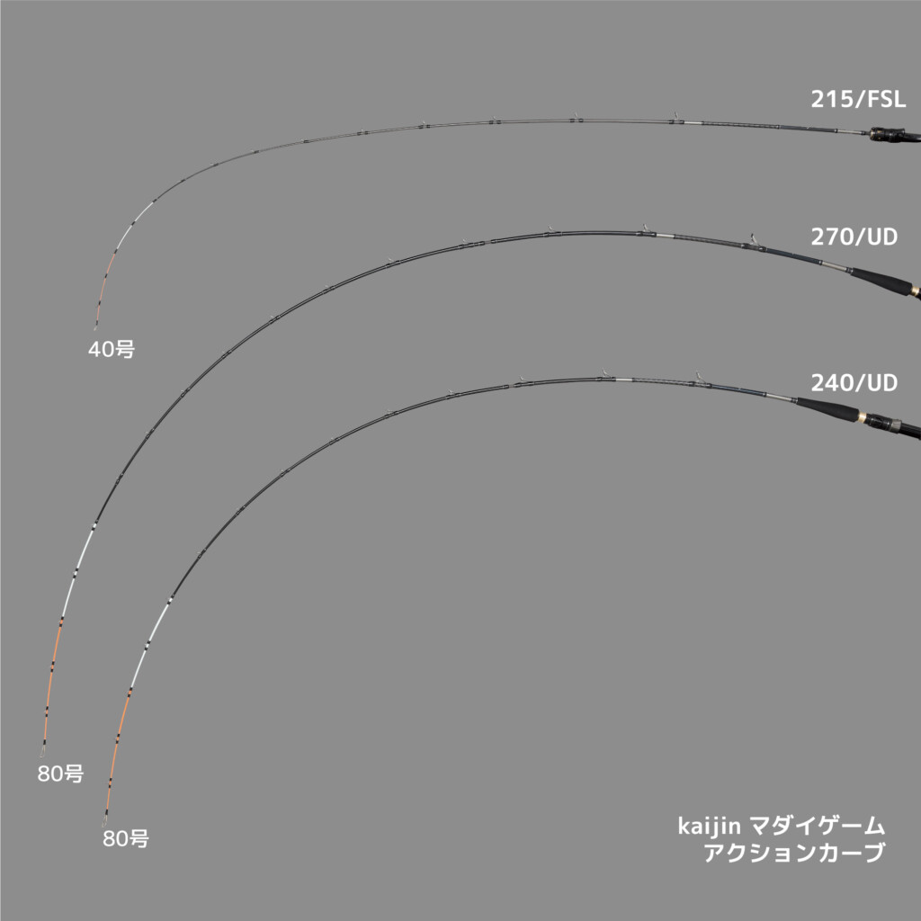 「kaijin マダイゲーム」は、東日本のコマセマダイを強く意識した、グラス素材の中でも、ひと際柔軟なUDグラスを採用した2モデルと、日本各地のタイラバも視野に入れたGSSカーボンソリッドモデルで、計3モデルがラインナップされたマダイ専用機。