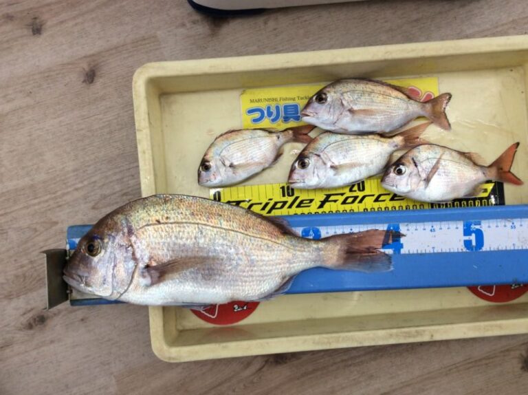 田ノ浦のカゴ釣りでマダイ42cm頭に5尾、見老津のフカセ釣りでサカモト氏グレ41cm頭に6尾とヘダイなど。