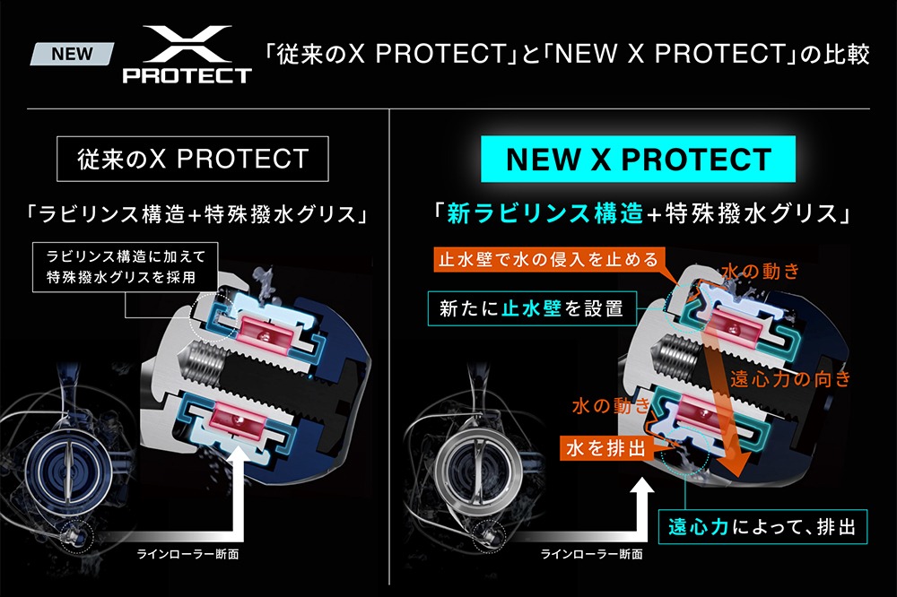 今作に搭載された“NEW Xプロテクト”は、「ラビリンス構造+特殊撥水グリス」に加えて遠心力を利用し、水を外部へ排出することでラインローラー箇所の耐久性を高めたテクノロジー。