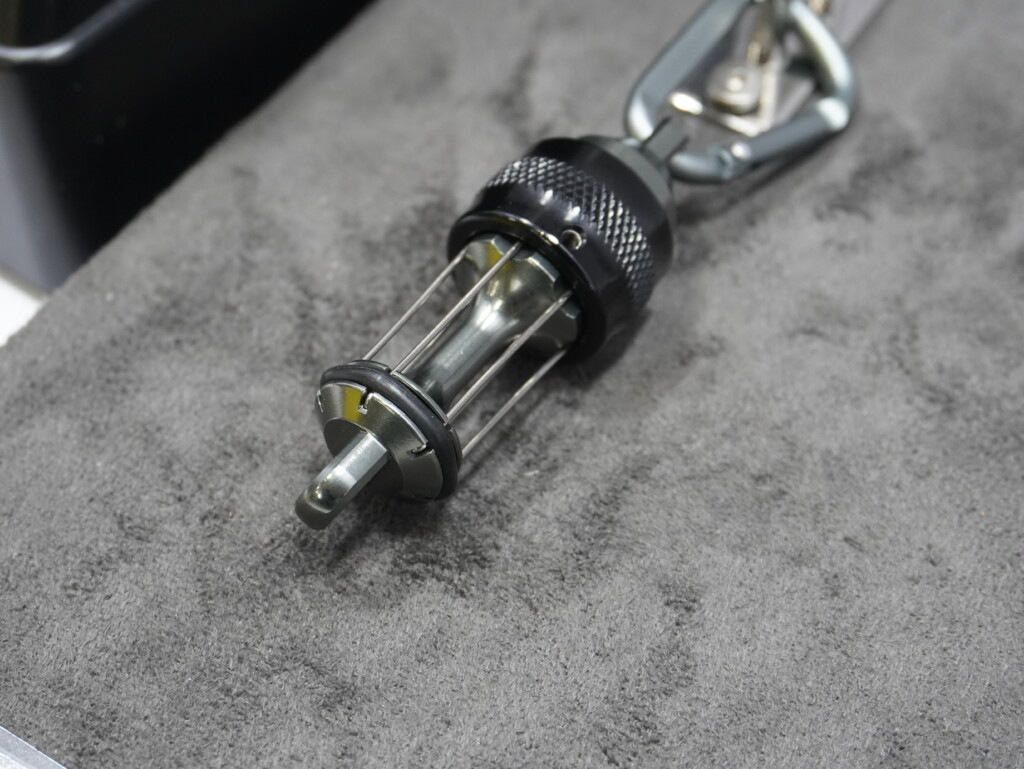 ホルダー本体はアルミ削り出しで作られているため、剛性に優れ、衝撃にも強い構造になっています。さらに、パーツを収納する部分にはしっかりとロック機能が備わっており、うっかりホルダーを逆さにしても中身が飛び出す心配はありません。頻繁に開け閉めしても、堅牢な素材が長持ちするので、コストパフォーマンスも期待できます。