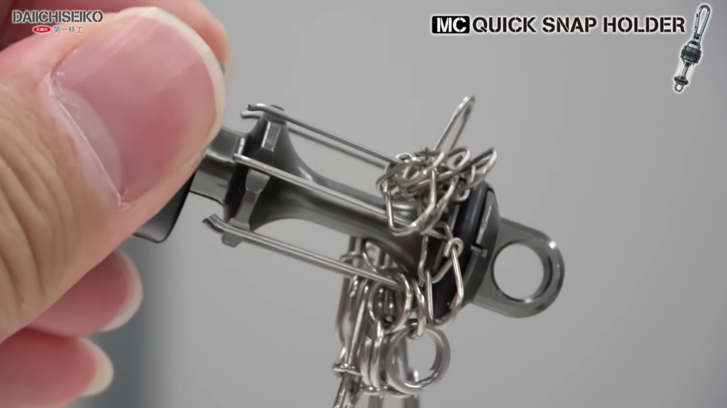 「MCクイックスナップホルダー」の特徴は、6本のワイヤーにそれぞれスナップやサルカンなどを収納できること。つまりサイズ違いで6種類に分けることができ、釣り場でスムーズな交換を可能としています。