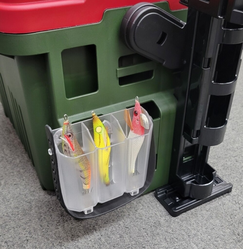 「スクイッドホルダーBM」は、多くのアングラーが愛用するタックルボックス「バケットマウスシリーズ」や「ランガンシステムボックスシリーズ」の側面にある多目的ホルダーに、カチッとワンタッチで装着できる専用のホルダーです。
