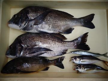メジロ62cmをギンペイのノマセ釣りで、チヌ43cm頭に3尾をコーンのフカセ釣りで