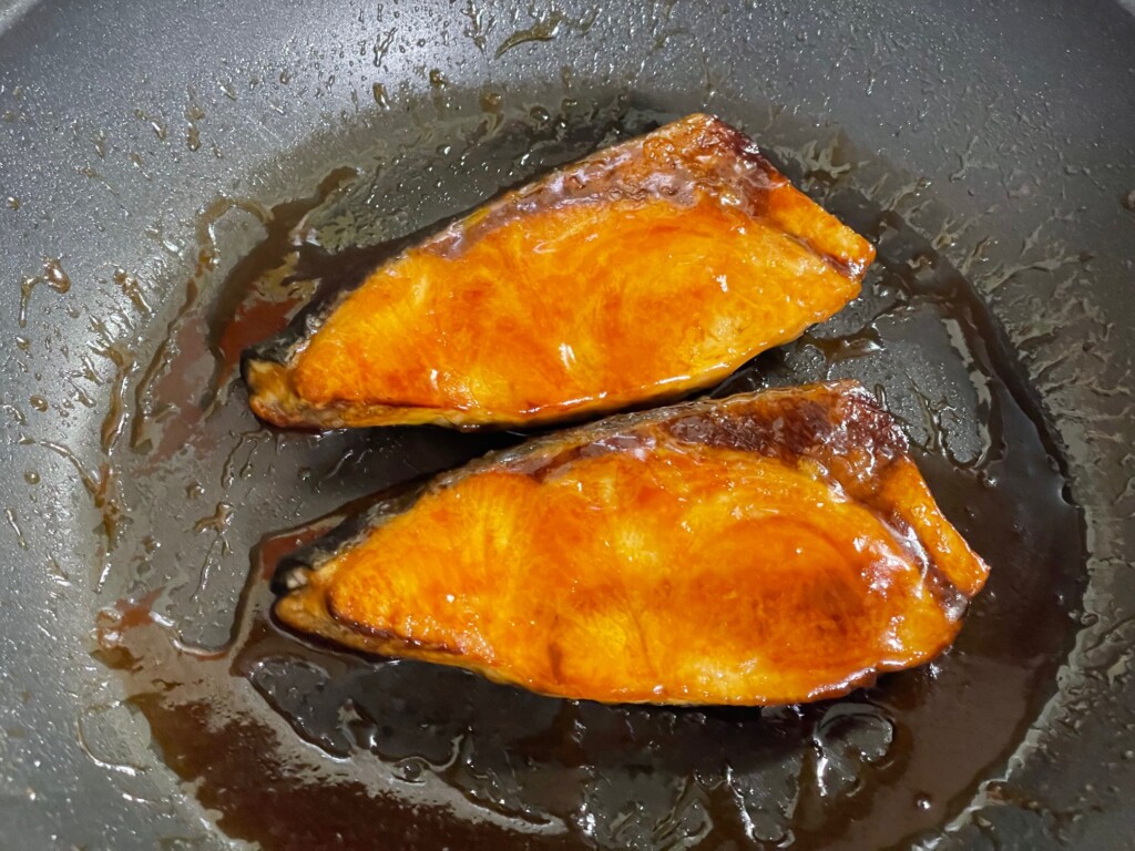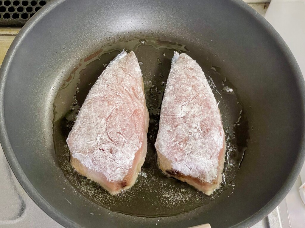 ③フライパンに米油を熱して、②のブリを皮目から焼き、両面にこんがりと焼き色が付くまでしっかりと焼く
