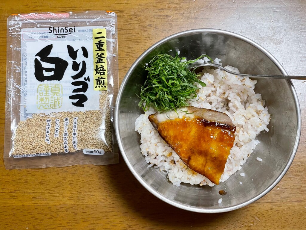 ⑤ボウルにご飯、ブリ、炒りごま、千切りにした大葉を入れて、よくまぜる