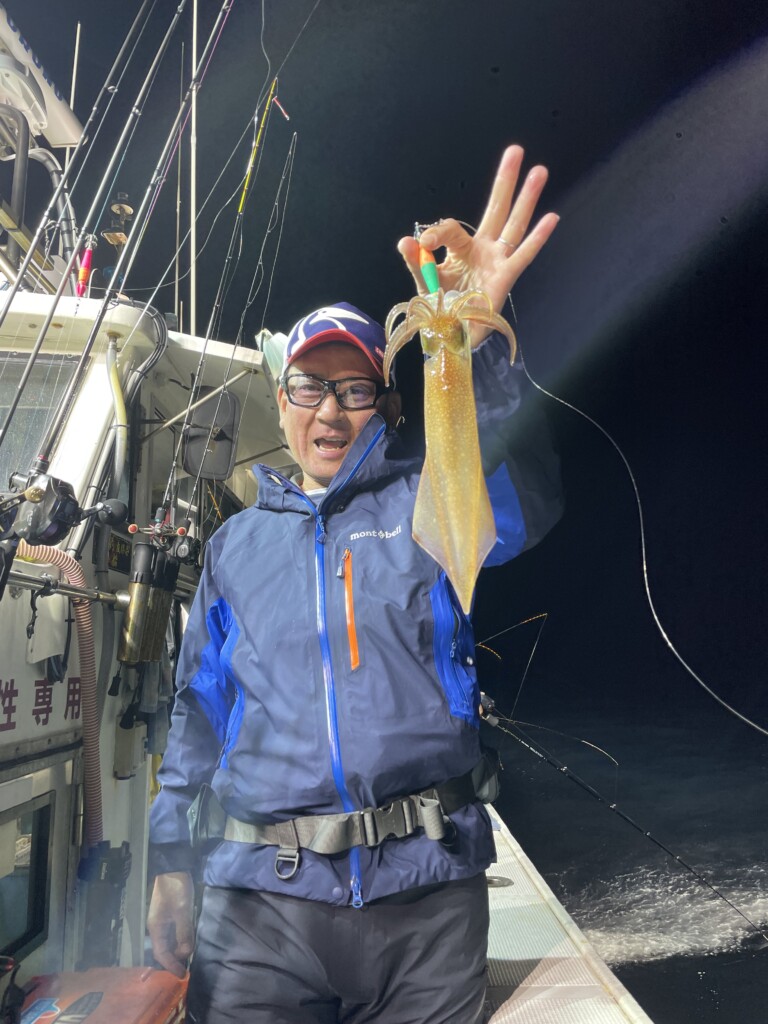 さて、夕方頃までイサギを楽しんだ後、イカのポイントへ向かいます。 到着したポイントの水深は87m。潮流は緩やかだったため、船はアンカーを落として、釣りを開始しました。 船長指示のメタルスッテの重さは15号。タナの傾向は、底の方とのこと。水深やタナは、シーズン序盤のセオリー通りですね。