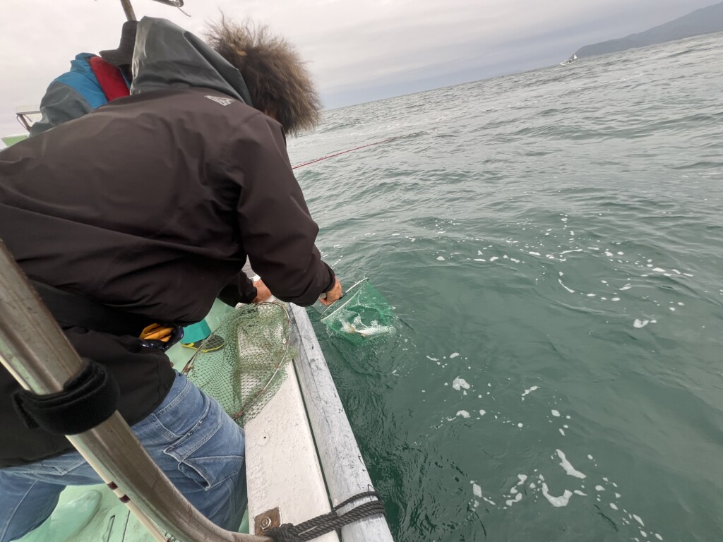 ▲魚をタモですくってくれる畑中船長