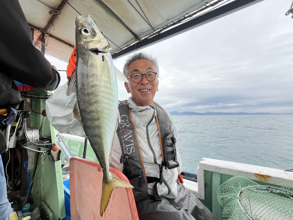 ここ数日、ここで大型のアジが釣れているようだ。ここでは次々に竿が曲がり、アジがヒットするが、デカいため、バラシも多い。そんな中でもアジが釣れ、畑中丸の常連は46cmの特大級をキャッチ。船中全員が40cm級を釣り上げた。