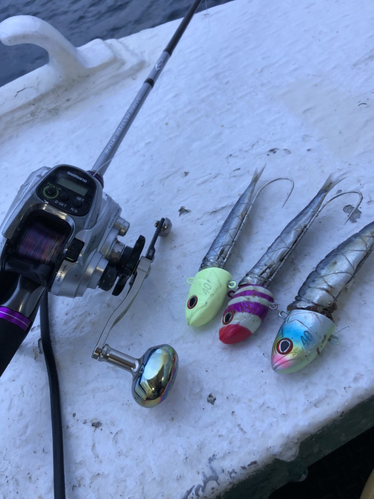 朝イチは、掛獲船太刀魚テンヤ40号のグローから始めた。