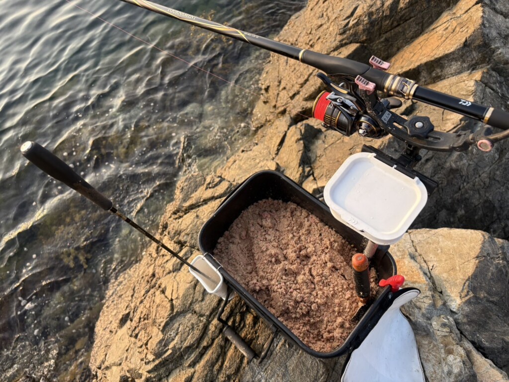 今回は、とある釣り大会で家島本島の東側に位置する磯に渡りました。足元にマキエを撒くと、大量のオセン(スズメダイの幼魚)とコッパグレ(小型のグレ)が集まってきます。これは遠投して撒き餌と仕掛けを分離させる必要があると考え、重量のある大きめのウキを選択しました。