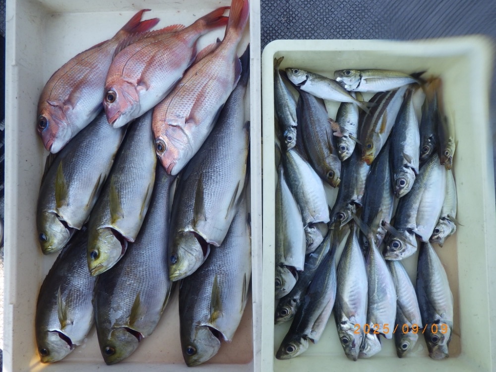 アジ&イサギ狙いで好釣果。アジは脂も乗っていて美味。マダイもまじってよい土産になっていました。