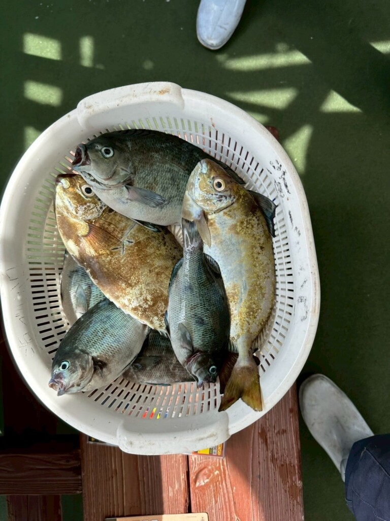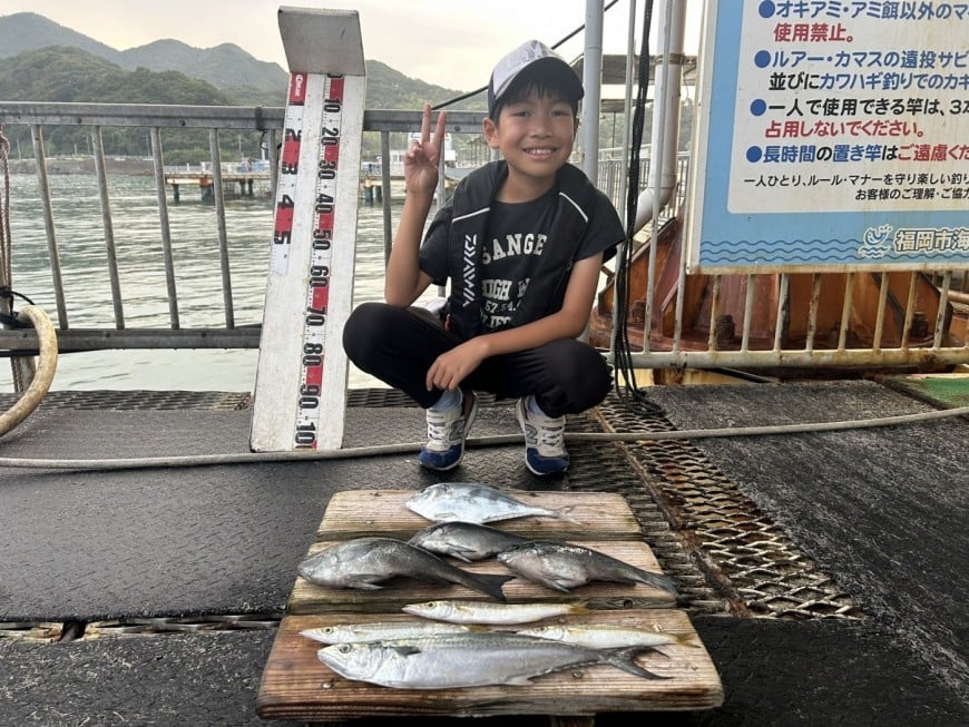 アジ10cm頭に10尾、サバ30cm頭に10尾、アイゴ20cm頭に2尾、メジナ22cm頭に3尾、カワハギ15cm頭に6尾、イサキ10cm頭に多数、キス20cm頭に3尾、マハタ、コチ。