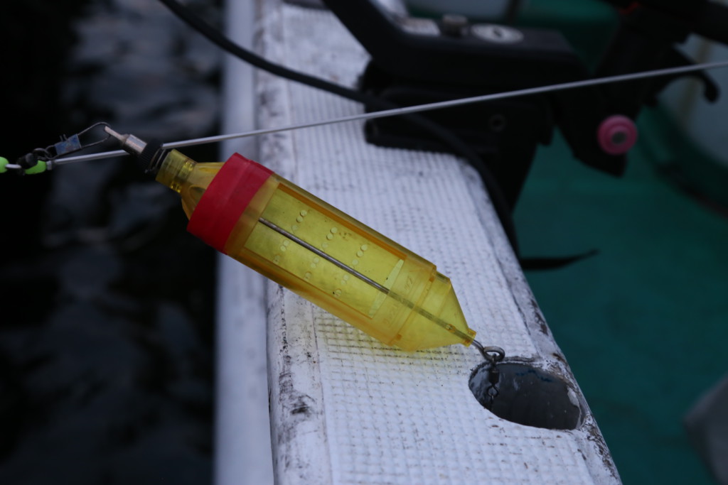 天ビンズボ釣りはマキエカゴの中にマキエを入れて、タナまで落として、マキエを撒いて近くの魚を寄せて釣るので、比較的アタる確率が高い釣りとも言えます。