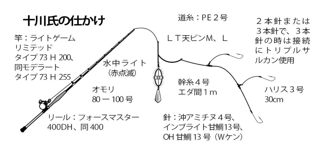 レンコダイもよい土産だが、十川氏は北村さんの仕かけが浮いていると見て、仕かけをサルカンを入れた重めの3本針にして浮かないようにし、かつ広くタナを探れるようにした。