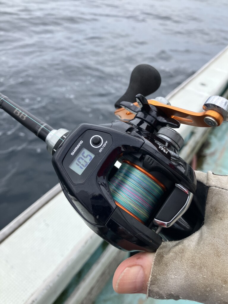 「見えないタナまで下ろすとアタリが大きくでるから、アタリを掛け合わせて楽しみたい人は、最初から10mぐらいまで下ろすのをオススメ」と船長。