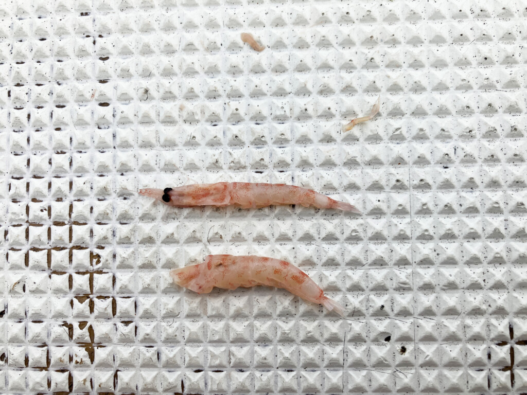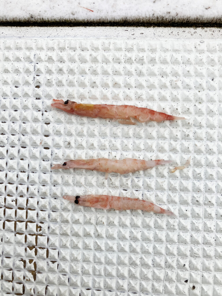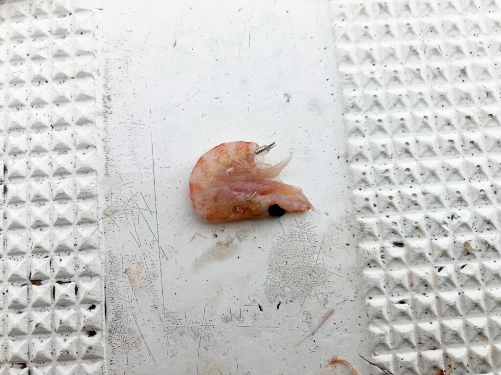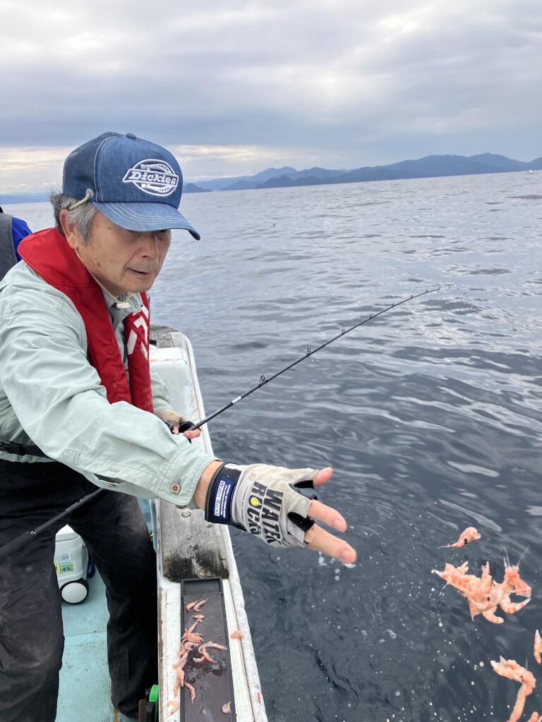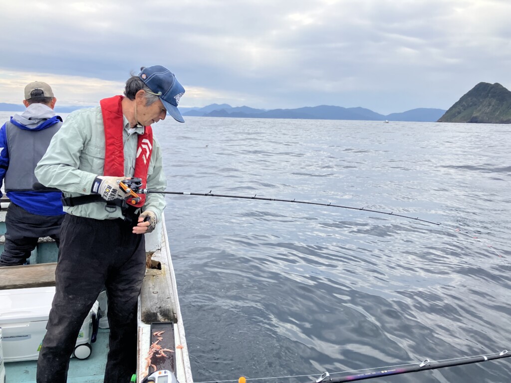 船長によると、食い込ませるためには小さく針に丸めて付けるのが針掛かり率も高いようで、小さなオキアミを選ぶのがよいのだそう。