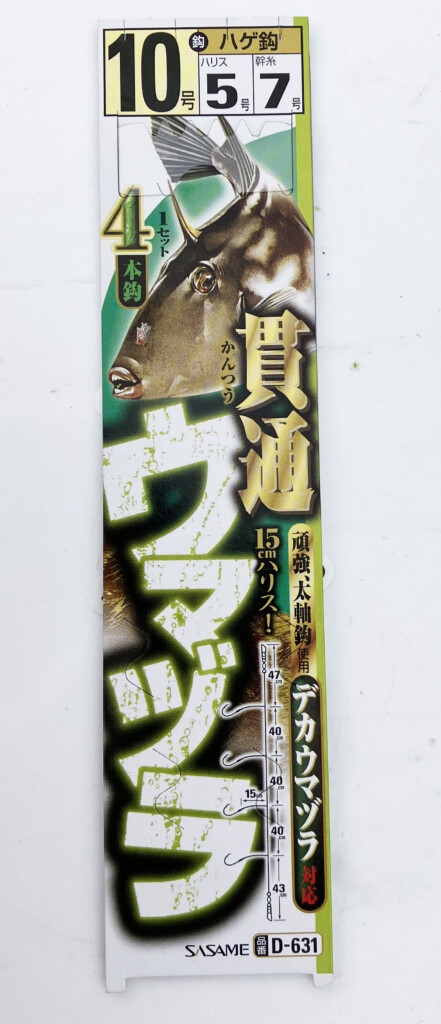 市販のカワハギ仕かけでハリスが5号以上の太さのラインナップはなかなかありませんが、ウマヅラハギ用で各社から発売されているモノを使うか、船五目用のエダの間隔が短いものを使うとよいです。