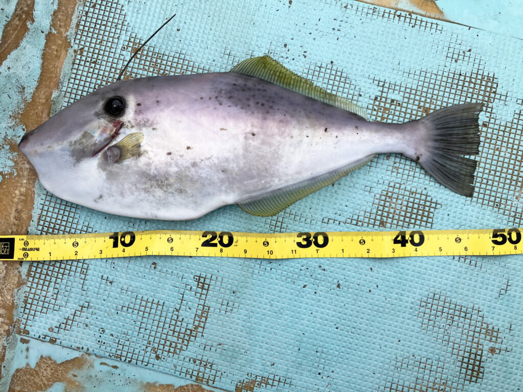 船長曰く「ウスバハギは学習能力の高い魚」。何尾か釣り上げれば、だんだんとスレてきてエサだけ上手く取られたり、アタリが小さくなるそうで…。