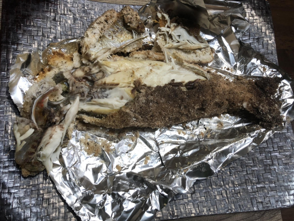 ②粗塩に乾燥ハーブミックスと卵白をまぜ合わせて、アルミホイルを敷いて、イサギ1尾を丸ごと隙間を作らないように包みます。
