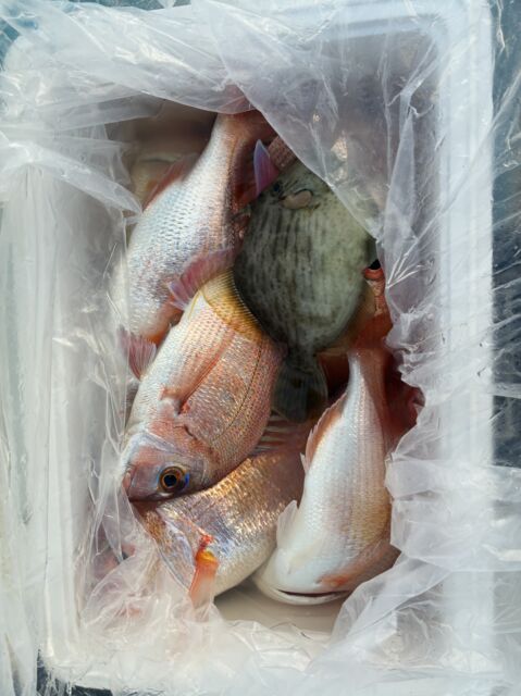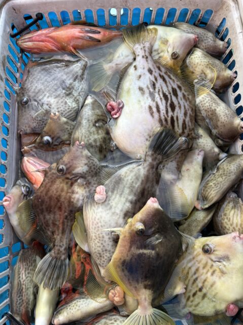 海況よく出船できれば、40cmオーバーの大型アマダイがコンスタントに上がっており魅力。ほかに、アオハタやレンコダイなどもまじります。