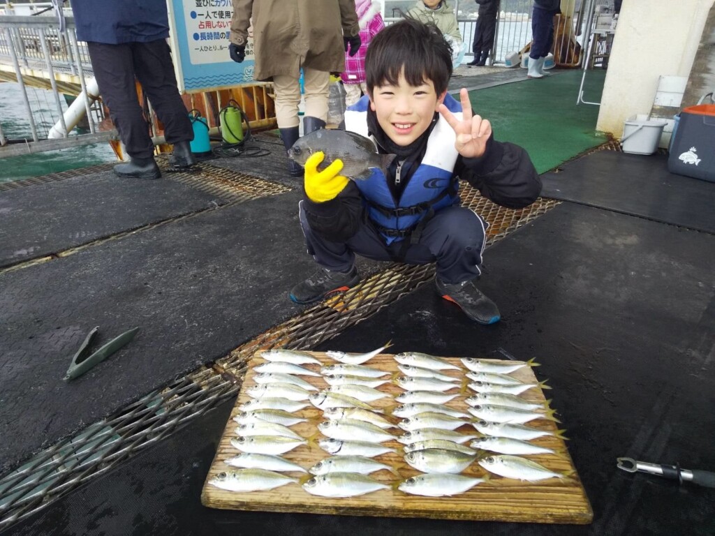 バリ35cm頭に3尾、チヌ46.8cm頭に13尾、クロ29.4cm頭に37尾、マダイ20cm、アジ29cm頭に多数、アオリイカ600g頭に5ハイ、カサゴ15cm、カワハギ20cm頭に3尾、キス25.5cm頭に25尾、サヨリ35cm頭に8尾、ウミタナゴ22cm頭に2尾、ヒラメ38cm、ブリ88.2cm、ワラサ79cm頭に2尾、ヤズ38cm頭に29尾。