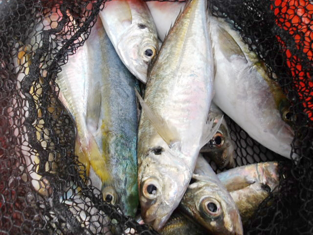 サワラ103cm頭に2尾、アジ28cm頭に30尾、カサゴ15cm頭に5尾、ヤズ40cm頭に5尾、マダイ25cm頭に5尾、チヌ28cm。