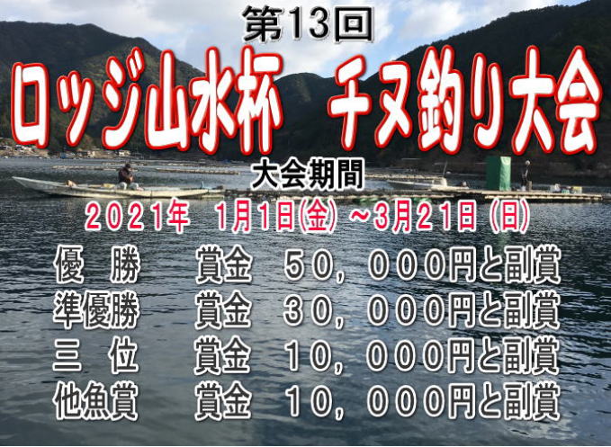 審査方法: 大会期間中にロッジ山水で釣り上げた真チヌ2尾の合計寸法による審査(ただし45cm以上に限る)
